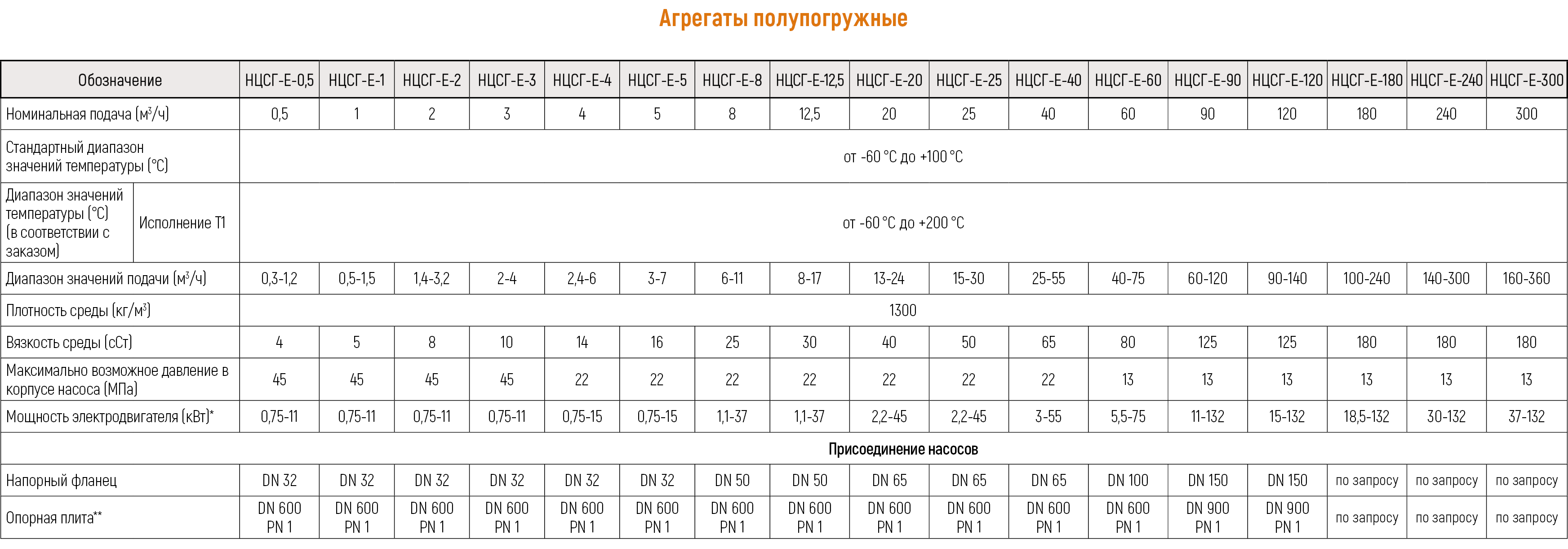 Насосы НЦСГ-Е рассчитаны на рабочую среду с плотностью до 1300 кг/м3 и вязкостью до 240 сСт. По согласованию возможно изготовление агрегатов для перекачивания жидкостей с иными характеристиками.